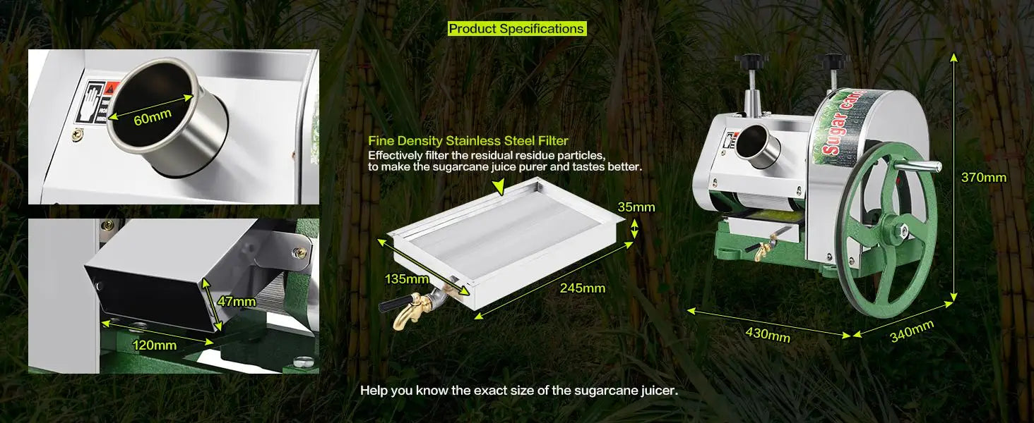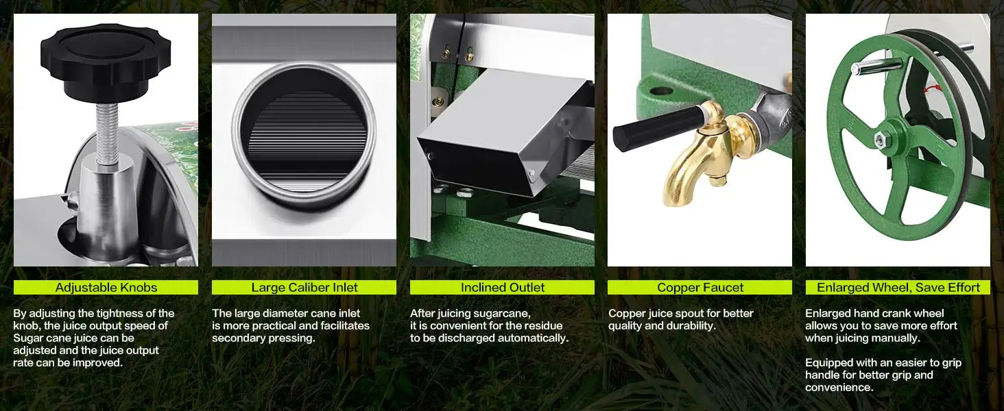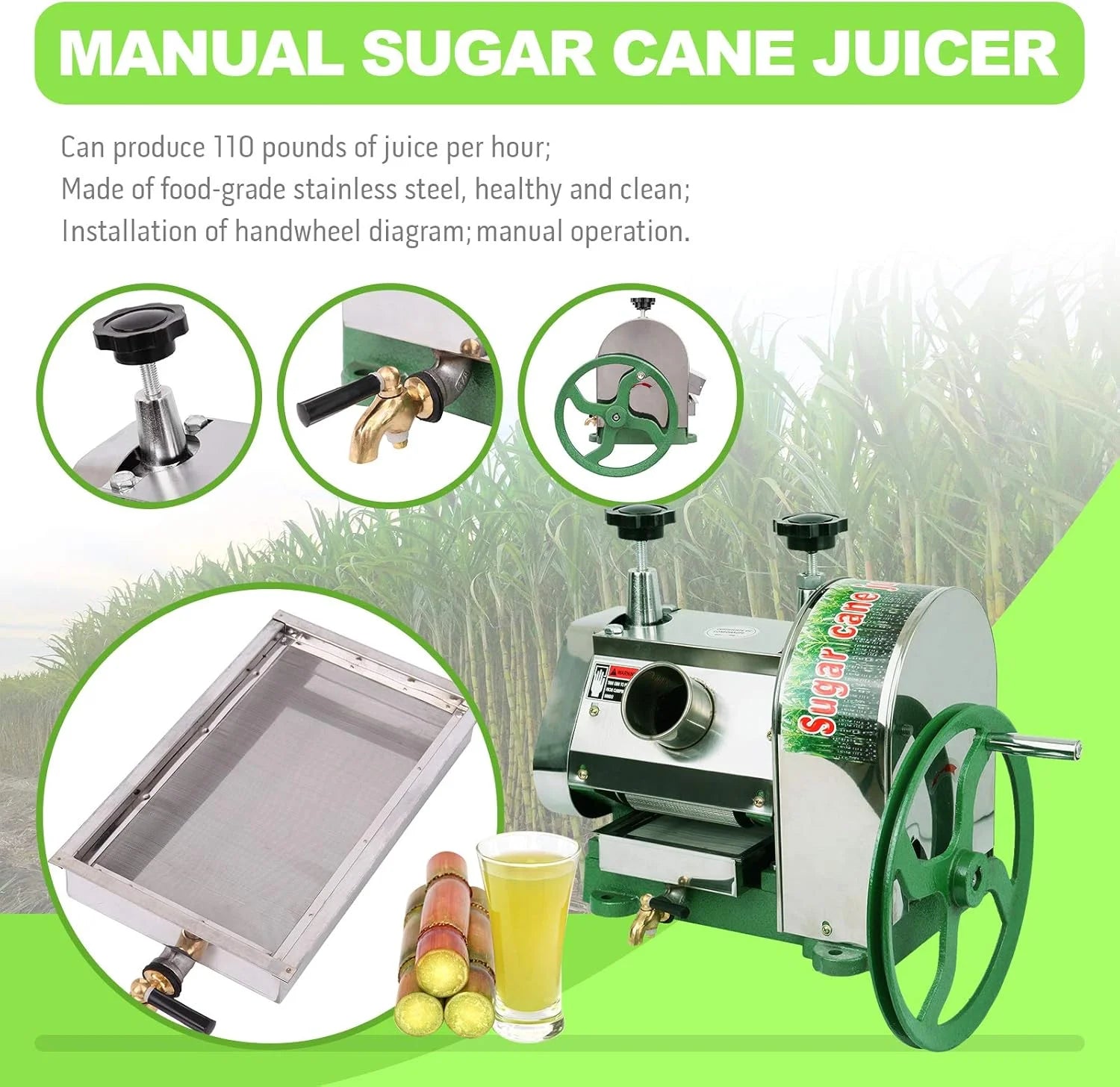 Manual Sugar Cane Juicer Machine Stainless Steel Sugar Cane Juice Press 110LBS Output per Hour 2" Inlet Sugarcane Juice Squeezer